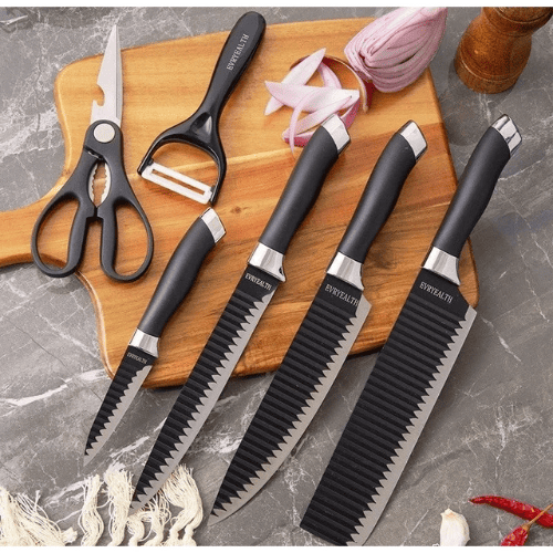 Facas profissionais – Kit com seis peças em revestimento antiaderente, lâminas super afiadas e design moderno na cor preta.